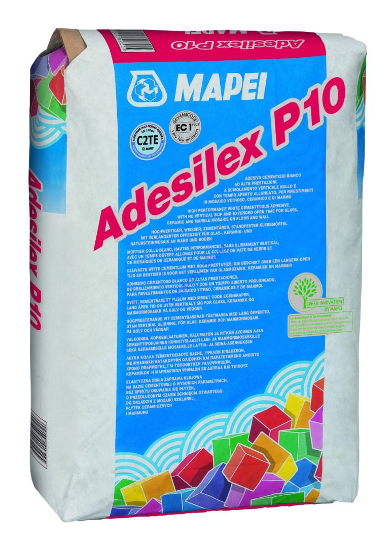 A Mapei Adesilex P10 kiváló minőségű, fokozott terhelhetőségű cementkötésű fehér ragasztóhabarcs, amelyet speciálisan üveg-, kerámia- és márványmozaikok rögzítésére terveztek. Kiemelkedő tapadóképessége és lecsúszásmentes formulája biztosítja a burkolatok stabil rögzítését mind falakon, mind padlókon.