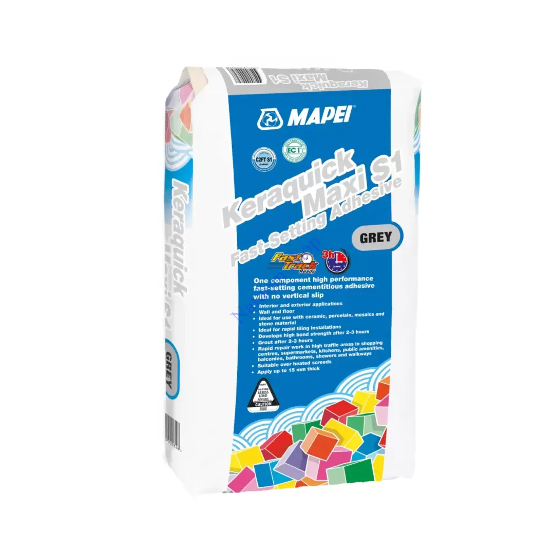 A Mapei Keraquick Maxi S1 Fehér egy kiváló minőségű, gyorskötésű, alakváltozásra képes ragasztó, amely különösen ajánlott fehér márvány, kerámia és természetes kő burkolatokhoz. A termék ultragyors kötési ideje révén a burkolt felületek már 24 óra múlva intenzíven használhatók. A könnyen bedolgozható állag és a csökkentett megcsúszás lehetővé teszi a pontos munkavégzést, akár függőleges felületeken is.